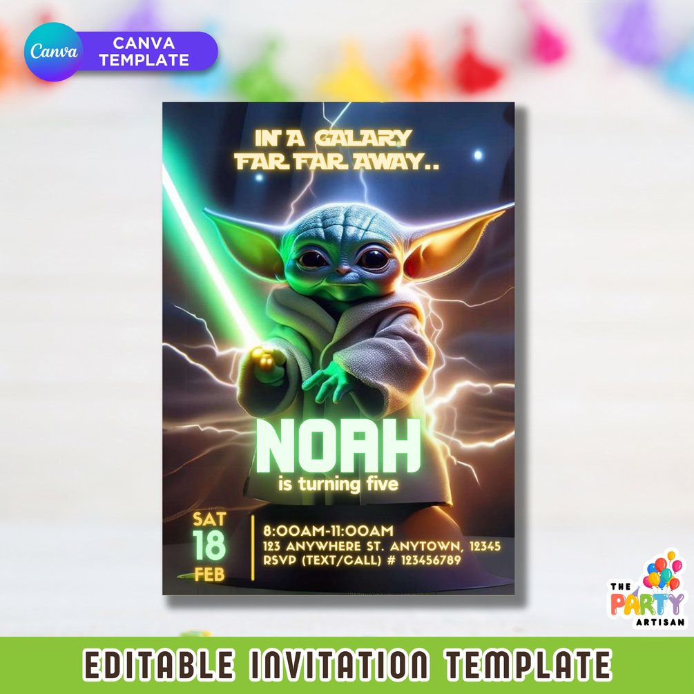 Join the adorable side of the Force with our Baby Yoda invitation Canva template! Featuring everyone's favorite little green Jedi, this customizable digital design sets the stage for an out-of-this-world birthday celebration. Download, personalize, and make your party a galaxy far, far away!